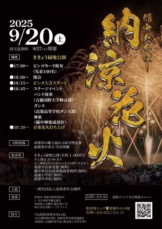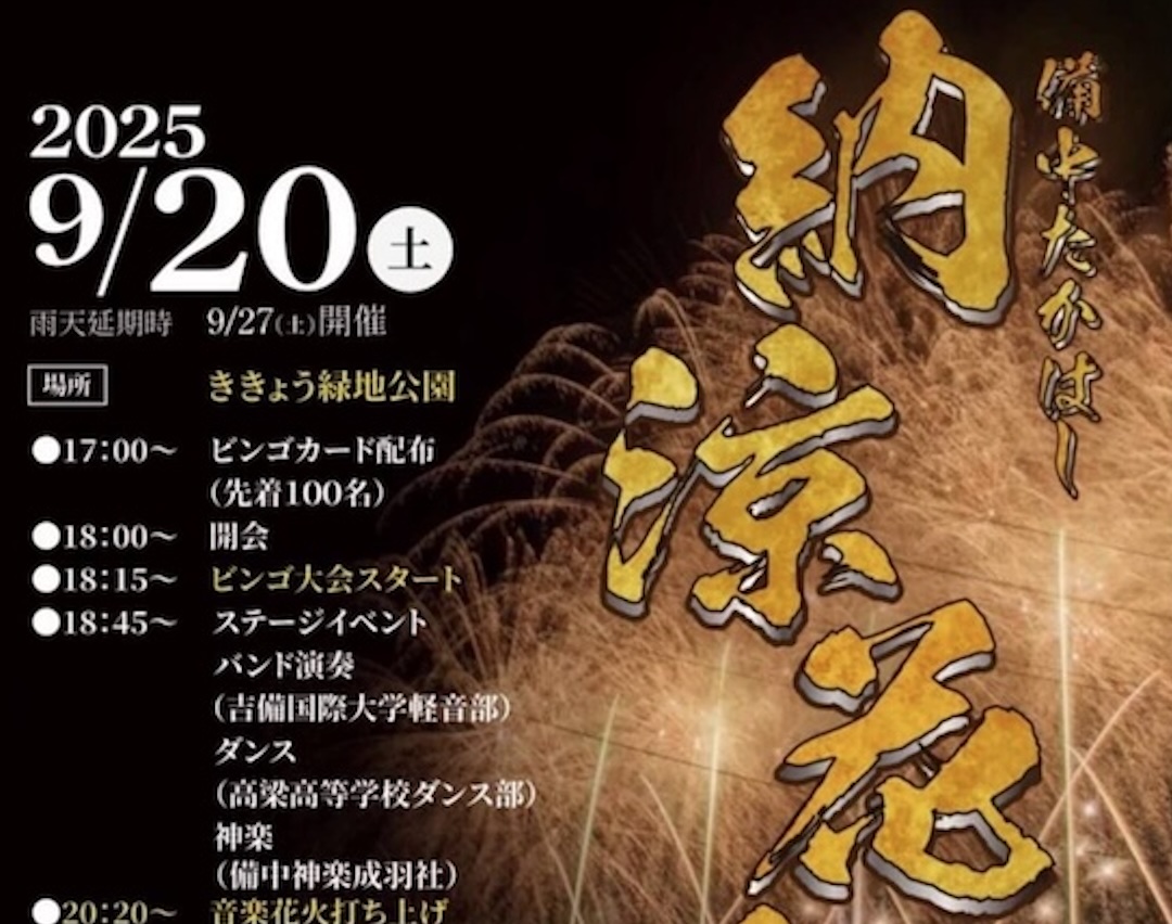2025年9月20日(土)、岡山県高梁市落合町のききょう緑地公園において「備中たかはし納涼花火」が開催されます。この花火大会は、高梁の夜空を音楽と花火がシンクロする音楽花火で彩る、地域の一大イベントです。