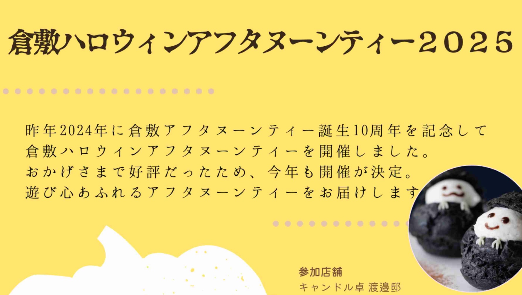倉敷市内の飲食店では現在、「倉敷ハロウィンアフタヌーンティー」が開催されており、ハロウィーン(10月31日)をテーマにしたスイーツや軽食が楽しめる特別なイベントが注目を集めています。2025年10月1日から11月10日まで、16店舗が参加して展開されているこのイベントは、価格帯2,000円~6,000円(要予約)で、各店舗が創意工夫を凝らしたハロウィン限定メニューを提供しています。