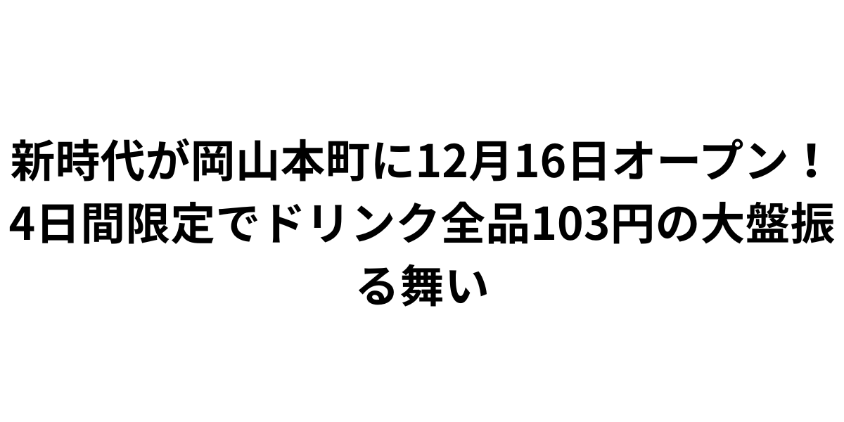 全国約200店舗を展開し、累計販売数3億本を誇る名物「伝串」で知られる大人気居酒屋「新時代」が、2025年12月16日(火)に岡山本町へ初出店します。オープンを記念して、12月16日(火)~19日(金)の4日間限定で、メガサイズ以外のドリンク全品が終日94円(税込103円)という破格のセールを実施。創業者・さのなおし氏のInstagramをフォローしていれば、誰でもこのスペシャルプライスでドリンクを楽しむことができます。