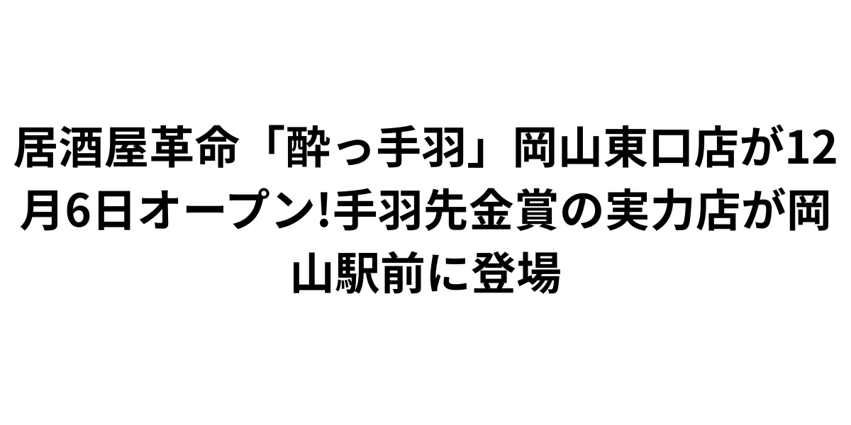 2025年12月6日(土)、岡山市北区本町にS.H.N株式会社の子会社である株式会社プロジェクトMが運営する居酒屋「居酒屋革命 酔っ手羽 岡山東口店」が開業します。本社を東京都渋谷区に置く同社は、全国各地で飲食店を展開する企業で、今回岡山への進出となります。