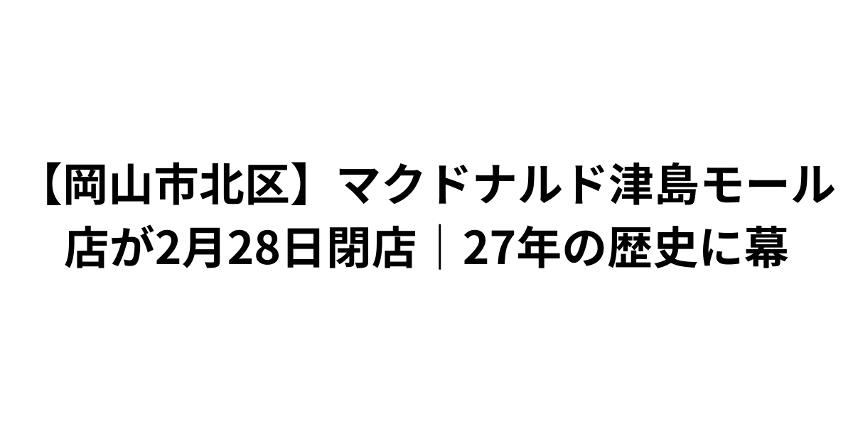 岡山市北区のフレスタモールカジル津島内にある「マクドナルド津島モール店」が、2026年2月28日(土)をもって閉店することが明らかになりました。1999年の開店から27年間、地域の人々に親しまれてきた店舗が、その歴史に幕を下ろします。