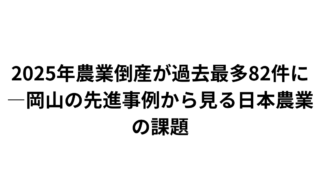 その他 2025年農業倒産が過去最多82件に―岡山の先進事例から見る日本農業の課題 農業倒産が過去最多を記録―2000年以降で初の80件超え 株式会社帝国データバンクが発表した「農業」倒産動向の調査結果によると、2025年の農業分野における倒産件数は前年比7.9%増の82件に達し、2000年以降で初めて80件を突破、過去最... 2026.02.10 その他